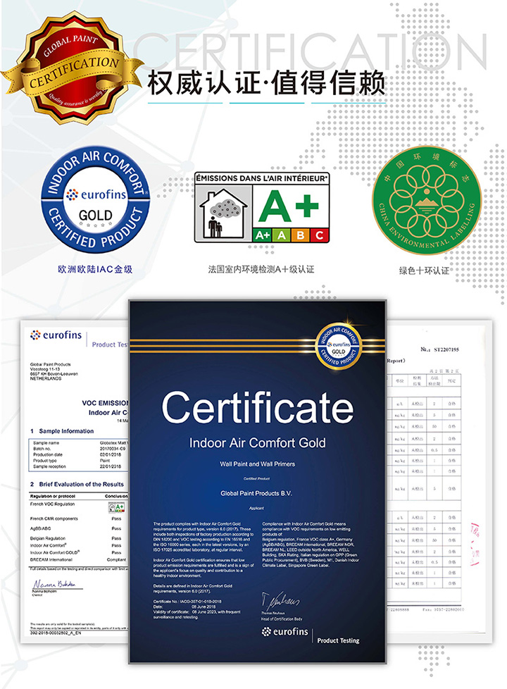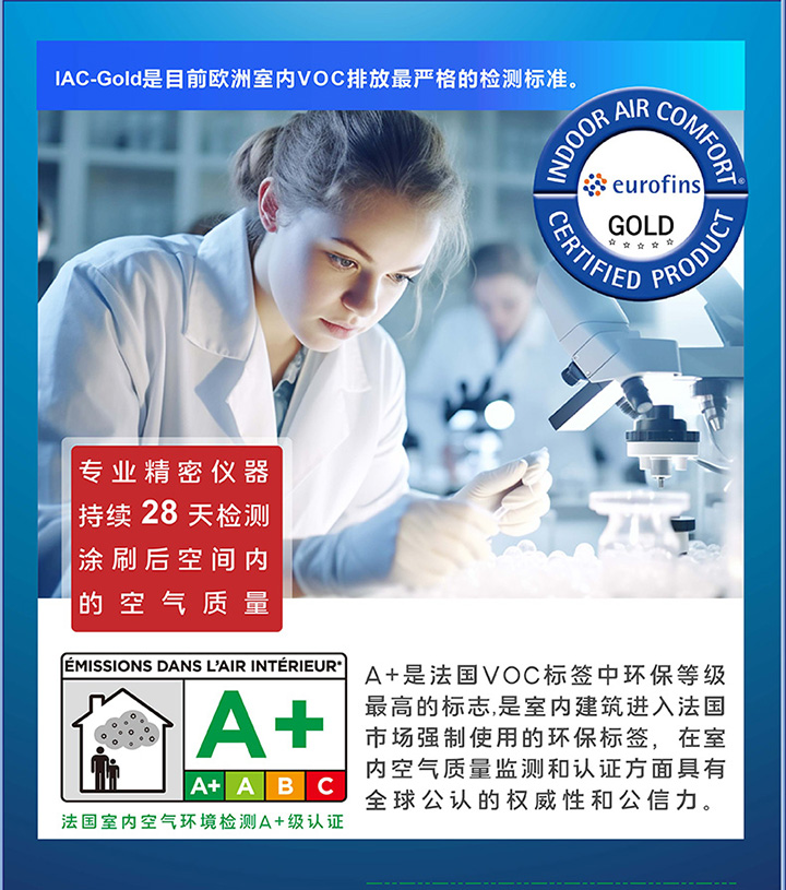 源自荷蘭,秉承歐洲綠色理念,通過嚴苛的歐陸IAC-GOLD金級認證及法國A+級認證,確保產(chǎn)品安全可靠,裝修無憂。