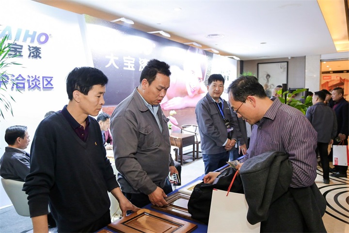 為促進家具企業升級,讓更多家具企業直觀的感受到大寶漆工藝效果,在現場大寶漆設立了展位,展示了大寶家具漆產品色板。環保轉型迫在眉睫,大寶漆涂裝黑科技樣板吸引著眾多家具企業前來咨詢洽談。