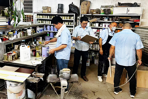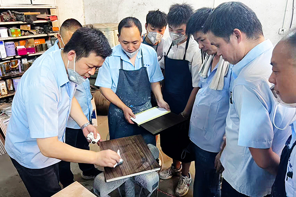理論課程后,趙副理帶領(lǐng)大家投入色板制作實(shí)戰(zhàn)。從白胚檢查、砂光處理,到底色施工、底漆噴涂、修色及面漆完工,每一個環(huán)節(jié)都結(jié)合產(chǎn)品特性與配比要求進(jìn)行實(shí)操演練,幫助大家真正掌握完整工藝流程,提升在實(shí)際服務(wù)中的應(yīng)對能力。