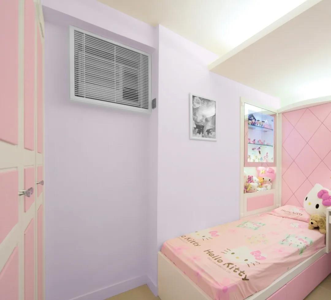 兒童房以淺紫、淺粉色為基調,可以營造出甜美的空間效果。淡紫色背景墻很好的消除了空間的單調感,十分溫馨。據稱,在色調溫和的環境中成長的孩子,性格也會變得更溫和。